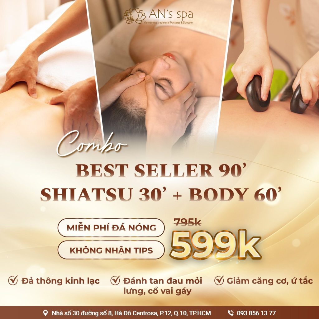Shiatsu massage 30’ + Body 60’ ( giá gốc 795.000 giảm còn 599.000, đã bao gồm tips, miễn phí đá nóng và các thảo dược chườm trong liệu trình )